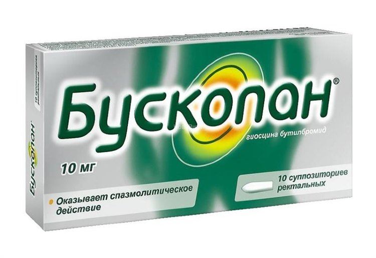 Суппозитории для ректального применения, один содержит гиосцин-N-бутилбромид 10 мг, 10 шт в упаковке.
