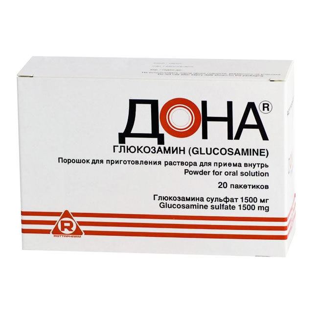 Дона - порошок для приготовления раствора для приема внутрь в пакетиках (саше), 1 саше содержит глюкозамина сульфат 1,5 г. 20 шт. в коробке.