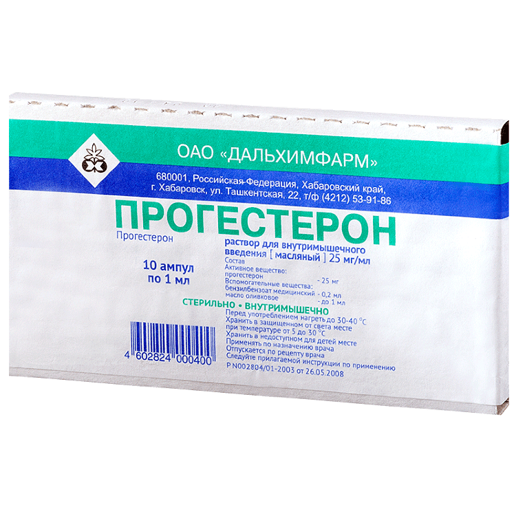 В 1 л масляного раствора для инъекций содержитсяся прогестерона 25 г. В ампуле 1 мл раствора. В упаковке 10 ампул.