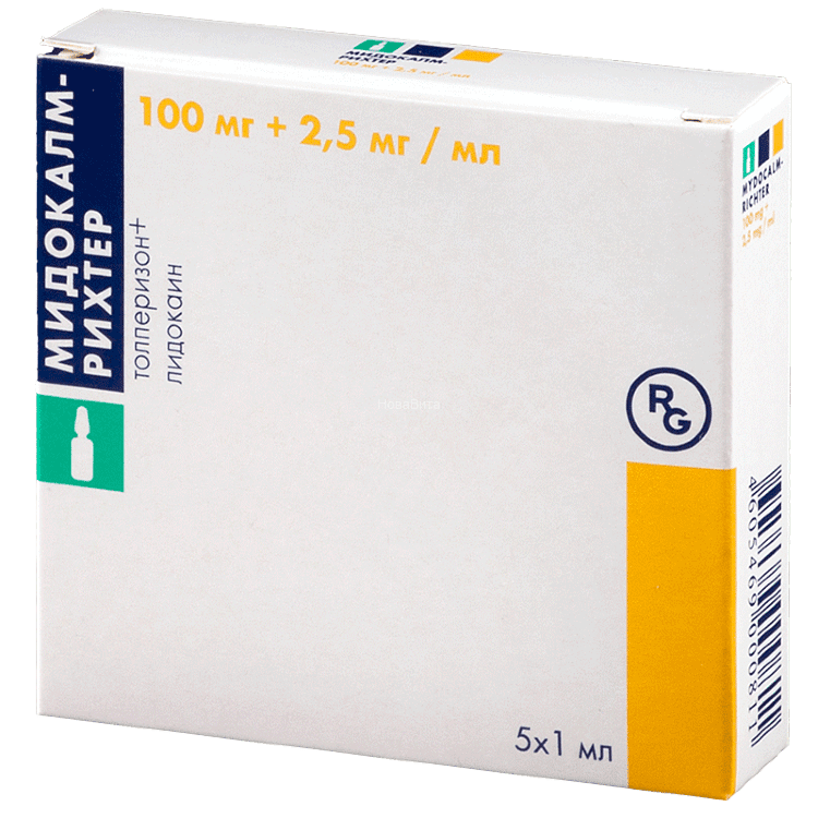 Раствор для инъекций бесцветный или слегка зеленоватый,1 мл раствора содержит тольперизона гидрохлорид 100 мг, лидокаина гидрохлорид 2.5 мг, 1 мл в ампуле, 5 ампул в картонной пачке.