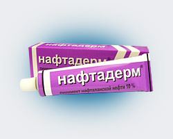 Нафтадерм - линимент 10%, действующее вещество нафталанская нефть рафинированная 10 г, вспомогательные вещества. В тубах по 35 г