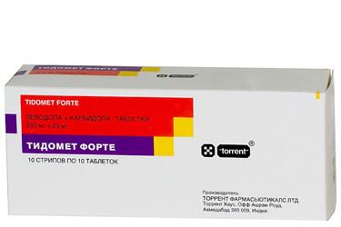 Таблетки, одна содержит карбидопа 25 мг, леводопа 250 мг, в упаковке 100 шт.