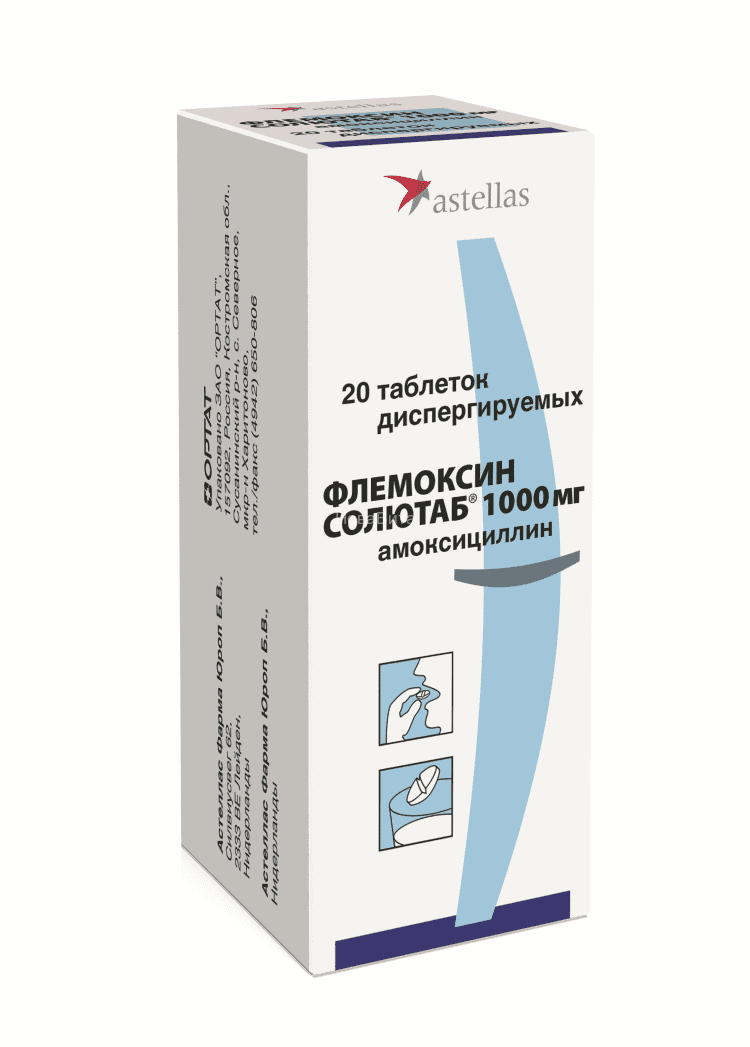 Таблетки диспергируемые, одна содержит амоксициллин (в форме тригидрата) 1000 мг. В упаковке 20 шт.