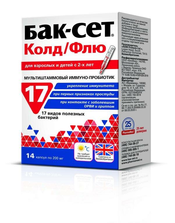 Присутствие сразу 17 штаммов (видов) полезных бактерий в препарате усиливает их иммуностимулирующее и противовоспалительное действие на организм без каких-либо нежелательных эффектов, что позволяет рекомендовать принимать Бак-Сет® Колд/Флю как при первых признаках заболевания, так и для профилактики простудных и вирусных заболеваний.