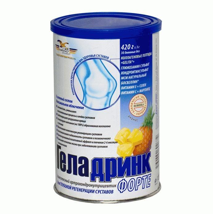 Геладринк Форте - порошок, со вкусом ананаса, содержит: пептидный коллагеновый гидролизат «Gelita», глюкозамин сульфат, хондроитин сульфат, МСМ натуральный, босвеллин, витамин С , витамин Е, селен, марганец. В банке 420 г.