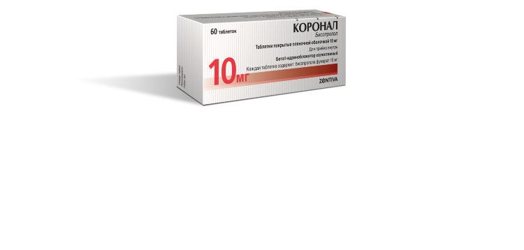 Коронал - таблетки, покрытые оболочкой, одна содержит бисопролола фумарат 10 мг, вспомогательные вещества, в упаковке 60 шт.