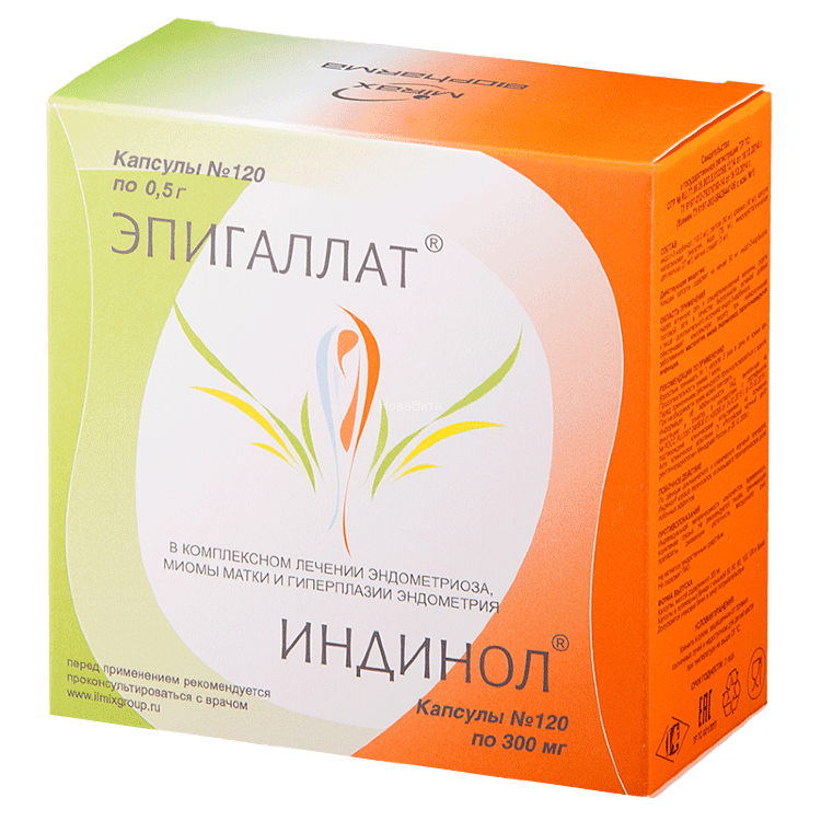 В составе комбинированной терапии (гиперплазия эндометрия без атипии, эндометриоз, аденомиоз, миома матки) Индинол рекомендуется принимать внутрь в сочетании с БАД Эпигаллат (1 капсула +1 капсула) во время еды в течение 2-3 недель. Возможно более длительное применение по рекомендации врача.
