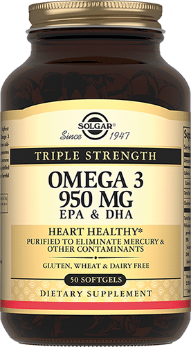 Жирные кислоты Омега-3 способствуют защите зрения, улучшению работы головного мозга, профилактике сердечно-сосудистых заболеваний, снижению уровня холестерина. «Тройная Омега-3 950 мг ЭПГ и ДГК» производится по уникальной технологии молекулярной дистилляции, методу, который позволяет удалить соли тяжелых металлов из рыбьего жира. Для защиты от прогоркания и окисления в каждую капсулу «Тройная Омега-3 950 мг ЭПГ и ДГК» добавлен натуральный витамин Е.