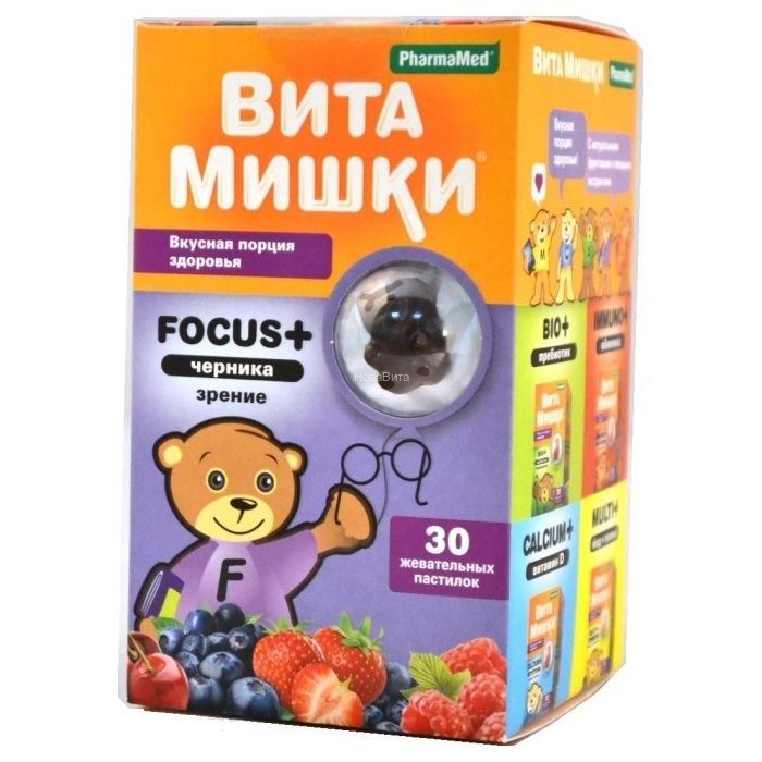 ВитаМишки® Focus + черника - сбалансированный витаминно-минеральный комплекс в виде вкусных мармеладных пастилок мишек с натуральными фруктовыми и овощными экстрактами для детей с 3-х лет.